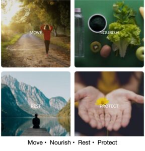 The Foundation is the ground. The four domains of everyday self-care — Move, Nourish, Rest, and Protect — that we tend to throughout our lives. None of them is ever finished. All of them matter. They form one ground, not a list.